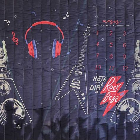 Cenário tapete mesversário Rock. Dupla Face com estampa exclusiva e divertida. Confira mais detalhes no site da Use Alce! tapete mesversário acompanhamento mensal dupla face escuro tema rock use alce.