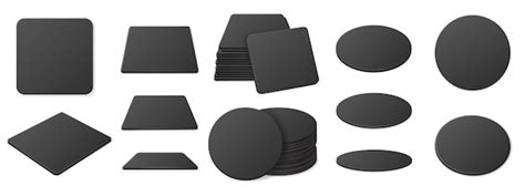 Vetor grátis porta - copos de papel preto para caneca de cerveja. maquete realista vetorial de tapete de cerveja quadrado e redondo em branco na vista superior. bierdeckel para copo ou tapete de papelão diferentes formas e ângulos isolados em fundo cinza.